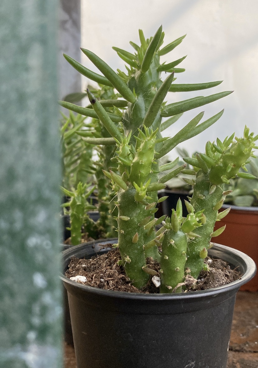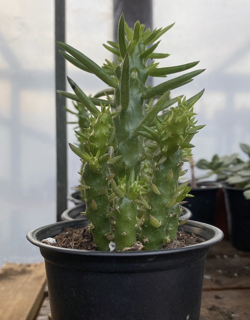 Η Austrocylindropuntia subulata είναι ένας ιδιαίτερος κάκτος με όρθια ανάπτυξη και σαρκώδεις βλαστούς που καλύπτονται από μικρά εξογκώματα και λεπτά αγκάθια. Ξεχωρίζει για τα μικρά, μυτερά φύλλα που εμφανίζονται στις κορυφές των βλαστών, δίνοντάς του μοναδική και «άγρια» εμφάνιση. Είναι ανθεκτικό φυτό, αγαπά τον ήλιο και χρειάζεται αραιό πότισμα με πολύ καλή αποστράγγιση. Ιδανικό για φωτεινά σημεία, συλλογές κάκτων και προστατευμένους εξωτερικούς χώρους.