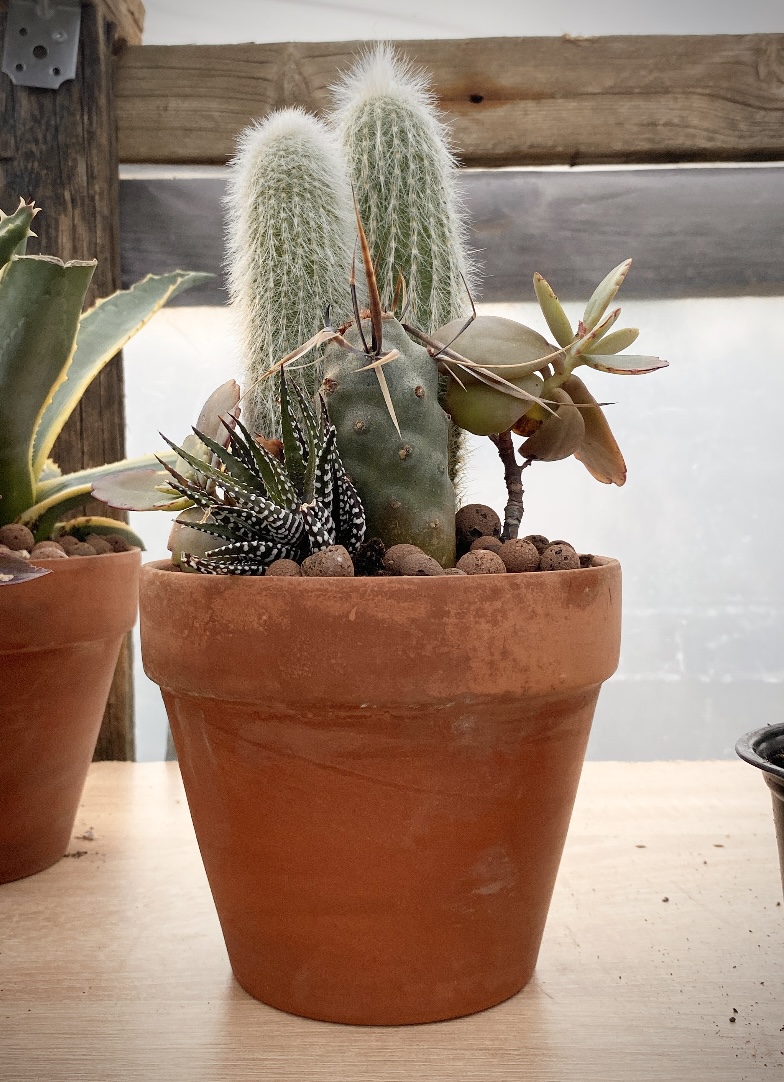Μια ξεχωριστή χειροποίητη σύνθεση με παχύφυτα και κάκτους, φυτεμένη σε πήλινη γλάστρα και διακοσμημένη με φυσικά υλικά. Κάθε φυτό έχει τοποθετηθεί με φροντίδα ώστε να συνυπάρχουν αρμονικά, δημιουργώντας έναν μικρό, ανθεκτικό κήπο με έντονο χαρακτήρα. Ιδανική επιλογή για φωτεινό χώρο, γραφείο ή δώρο που κρατά στον χρόνο και δεν χρειάζεται απαιτητική φροντίδα.