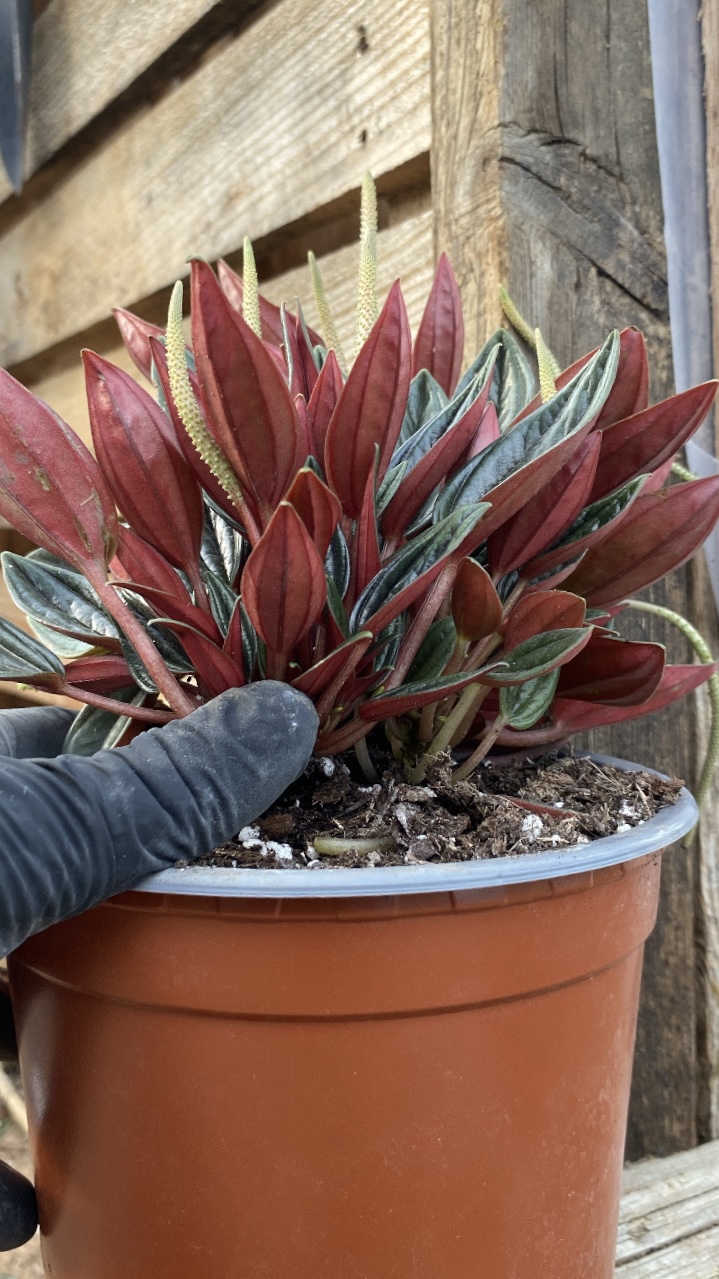 Η Peperomia Rosso είναι ένα ιδιαίτερο φυτό εσωτερικού χώρου με συμπαγή και πυκνή ανάπτυξη, που ξεχωρίζει για τα σκουροπράσινα φύλλα της και το βαθύ μπορντό χρώμα στην κάτω πλευρά τους. Δημιουργεί έναν όμορφο όγκο και δίνει ένταση και χαρακτήρα στον χώρο χωρίς να τον βαραίνει. Το φυτό είναι ήδη ανθισμένο, με διακριτικές αλλά εντυπωσιακές ανθοφορίες που αναδεικνύουν ακόμη περισσότερο τη φυσική του ομορφιά. Είναι ανθεκτικό και εύκολο στη φροντίδα, κατάλληλο ακόμη και για όσους δεν έχουν εμπειρία με φυτά. Αγαπά το έμμεσο φυσικό φως και χρειάζεται πότισμα μόνο όταν στεγνώνει το χώμα στην επιφάνεια, γεγονός που το καθιστά ιδανικό για καθημερινούς χώρους όπως το σαλόνι, το υπνοδωμάτιο ή το γραφείο. Καλλιεργείται με φροντίδα και αγάπη από τη VivaNina Plants και είναι έτοιμο να δώσει ζωή και φυσική ισορροπία στον χώρο σας.